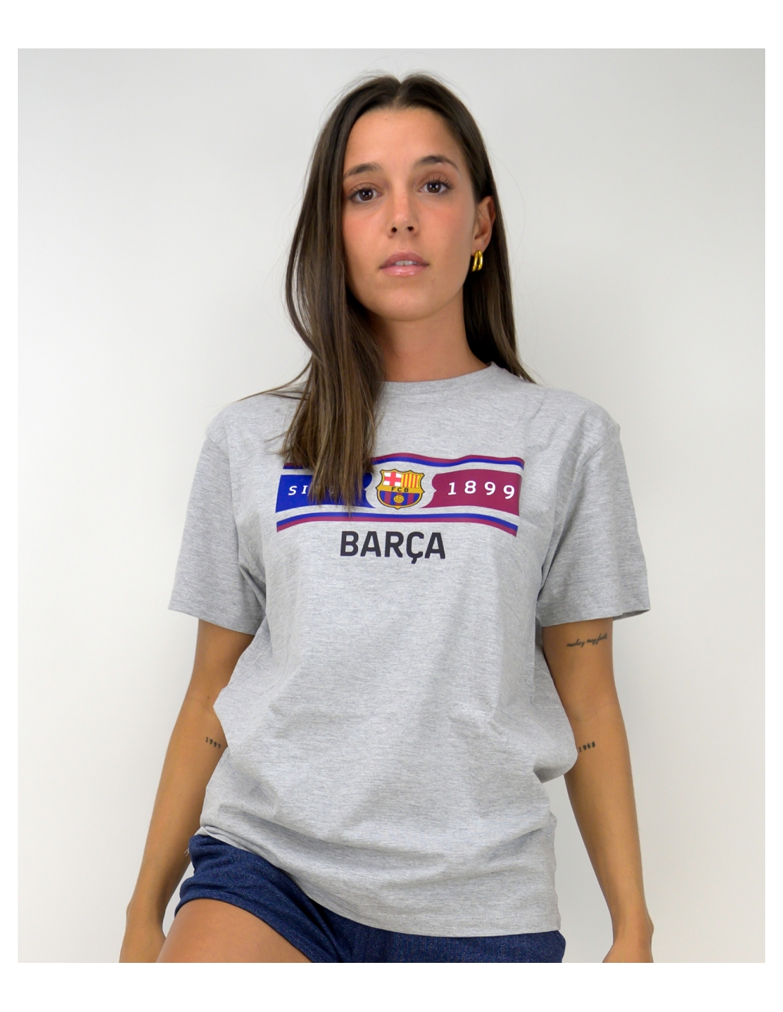 Esta camiseta gris del FC Barcelona para mujer es una prenda versátil que combina comodidad y orgullo culé. Su diseño estampado destaca el logo del club, acompañado del lema "Barça" y la fecha de creación, reflejando la historia y pasión por el equipo.