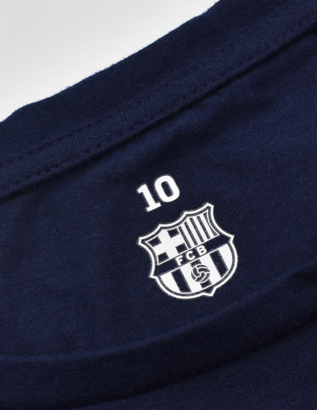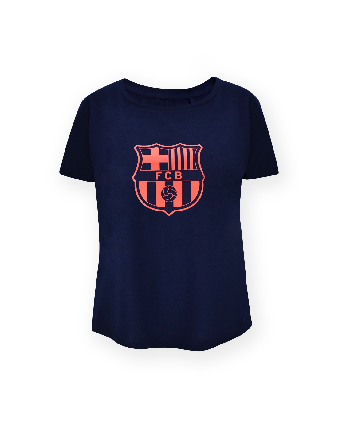Camiseta oficial FC Barcelona para niño en azul marino con escudo coral. Comodidad, estilo y orgullo culé para el día a día.
