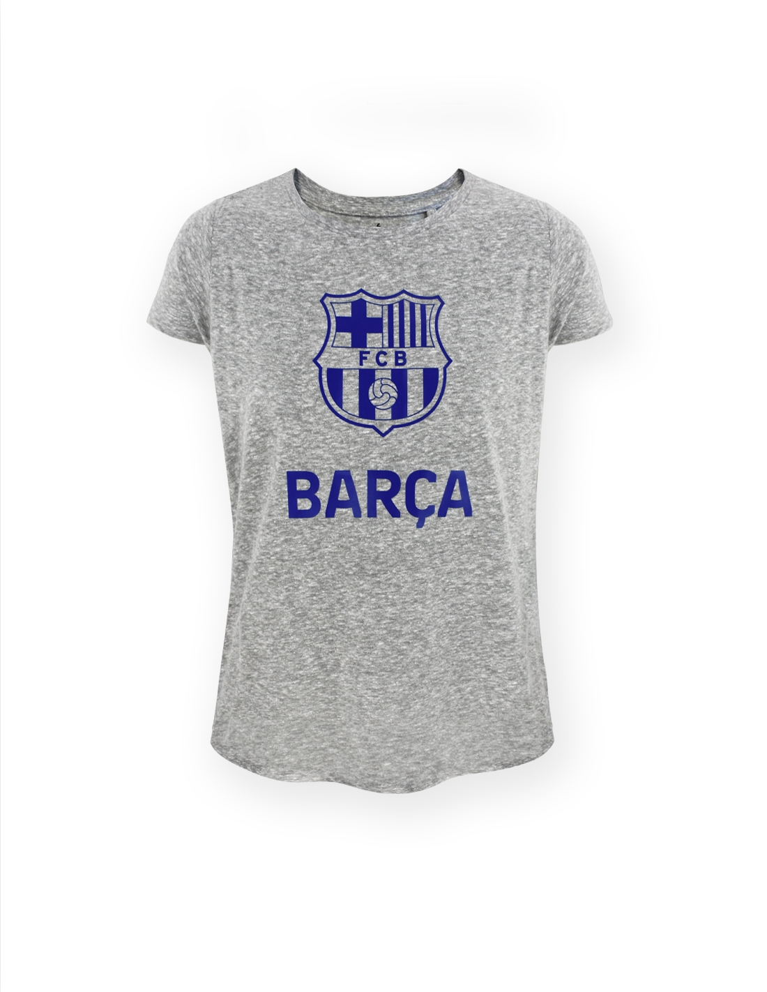 La camiseta oficial del FC Barcelona en versión junior ofrece un diseño moderno y cómodo para los jóvenes culés. Confeccionada en suave algodón gris vigoré, luce el escudo del club y la palabra “BARÇA” en azul, creando un contraste elegante y lleno de identidad. Ideal para el día a día, actividades deportivas o animar al equipo desde cualquier lugar.