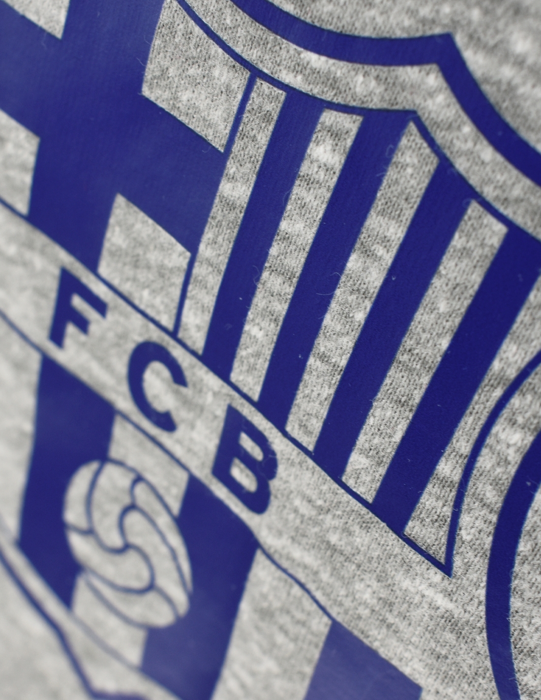 Diseño juvenil: estampado frontal con escudo azul y texto “BARÇA”.