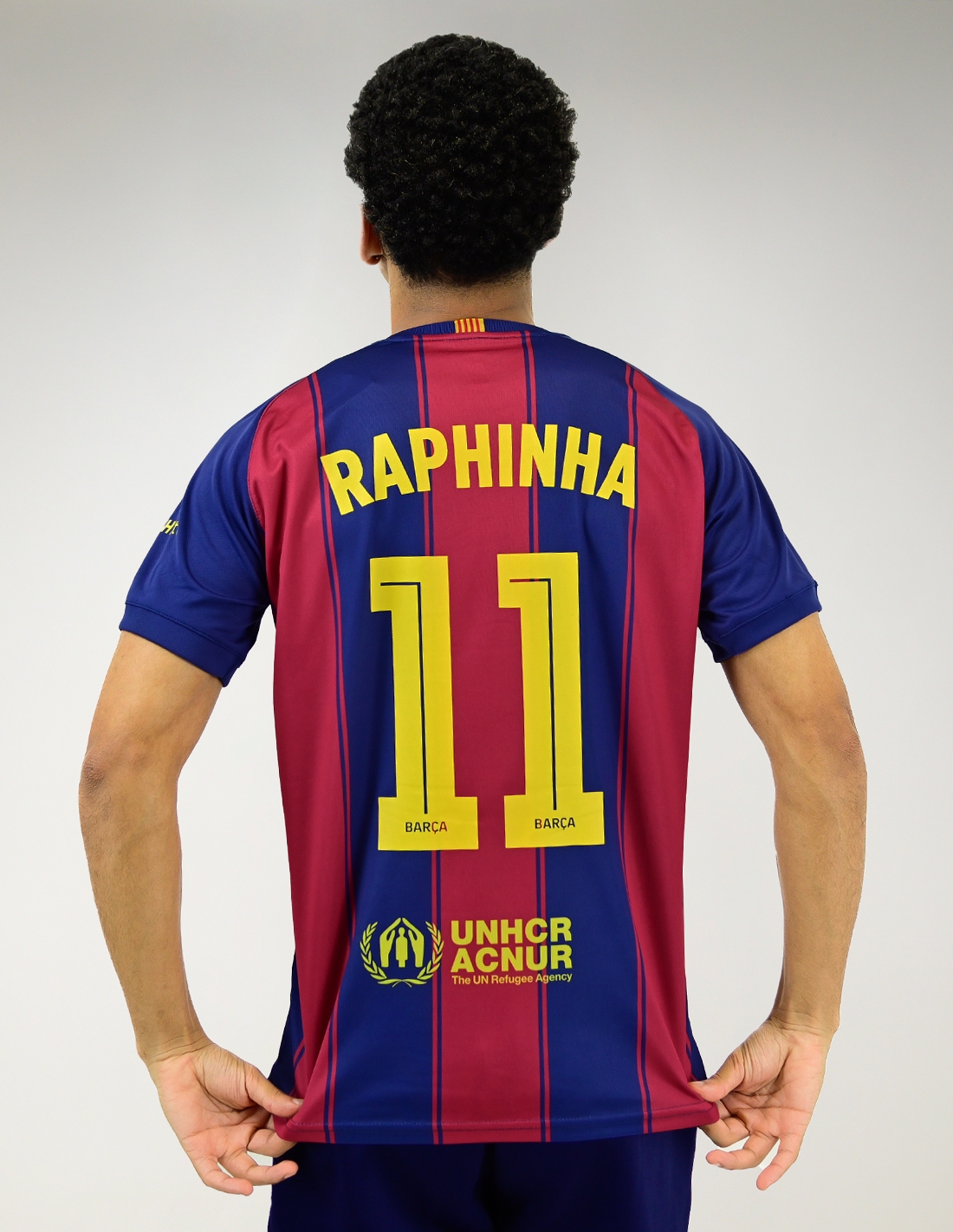 - Diseño oficial: réplica de la primera equipación del Barça con el nombre y dorsal de Raphinha.
