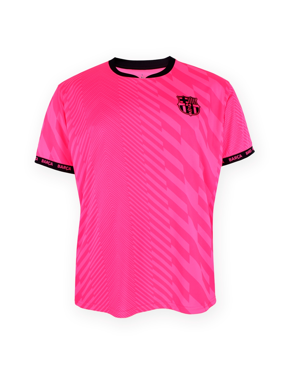 Camiseta FC Barcelona fucsia infantil con diseño gráfico moderno, escudo oficial en negro y detalles BARÇA. Ligera, cómoda y perfecta para el día a día.
