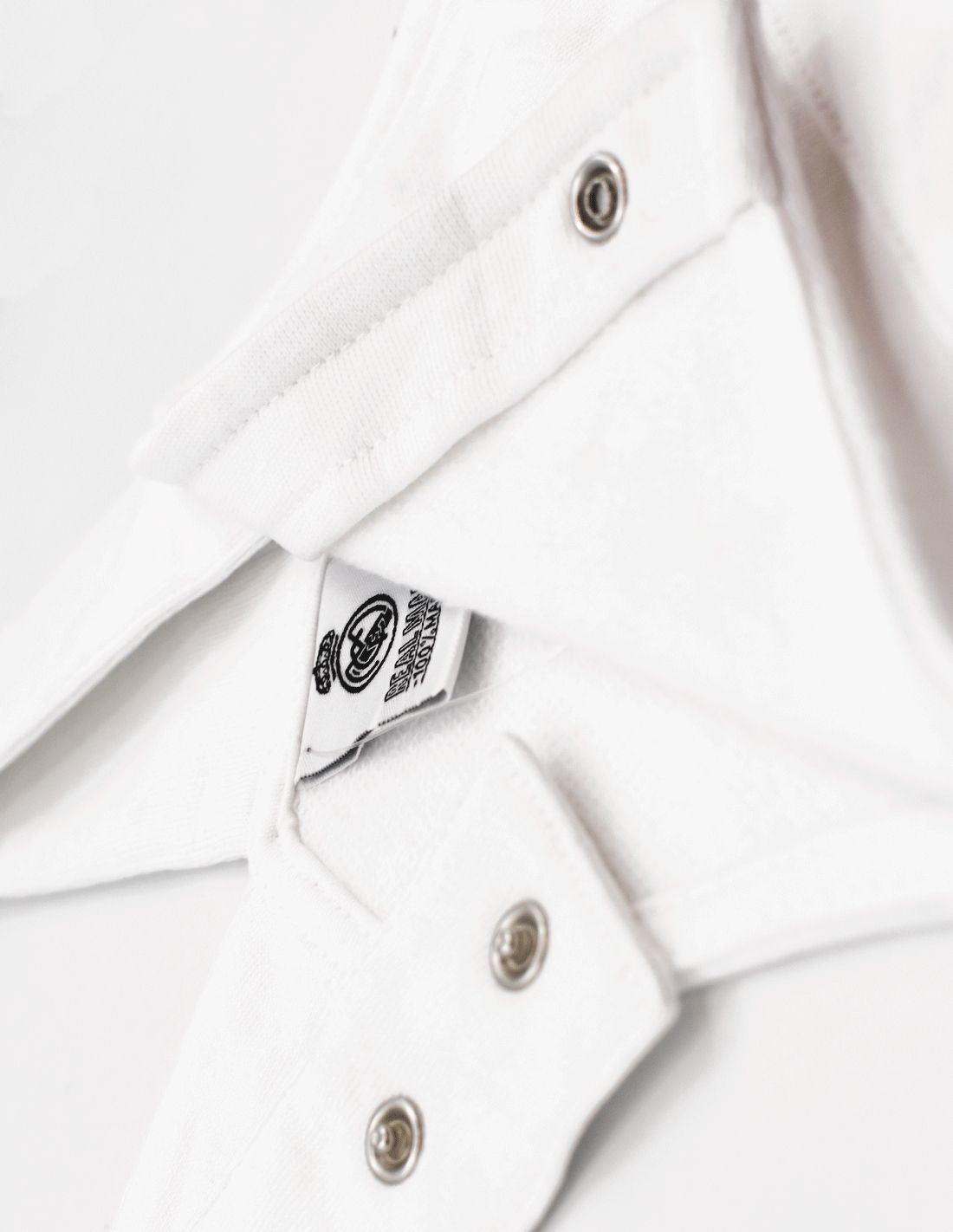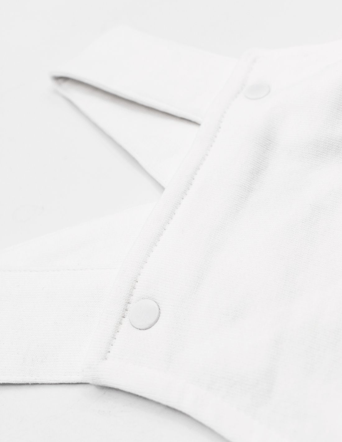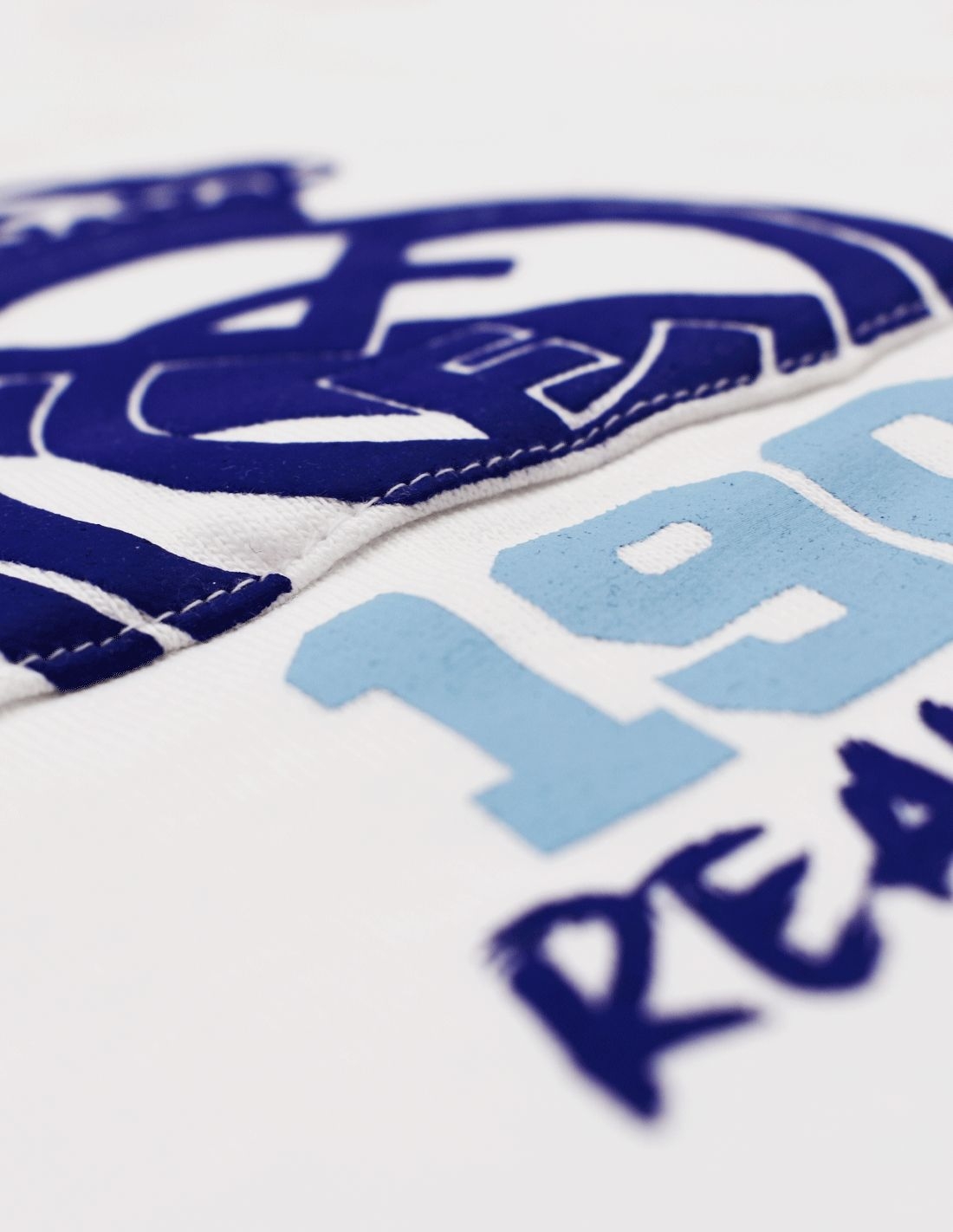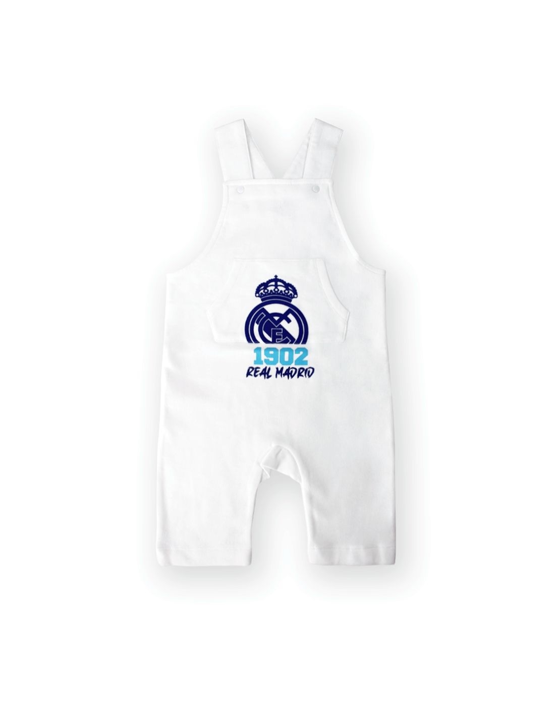 Este peto blanco Real Madrid es la prenda ideal para los más pequeños de la casa. Su diseño cómodo y funcional destaca por el escudo del club en el centro y el año de fundación "1902" en color azul celeste, aportando un toque auténtico y representativo.