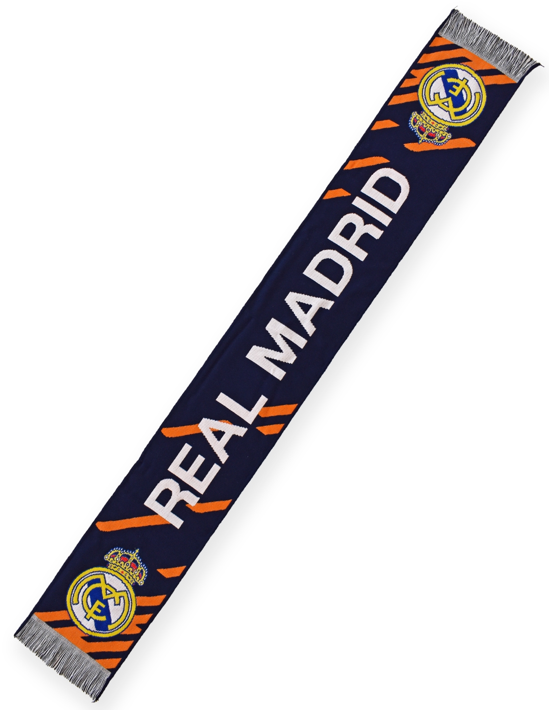 Esta bufanda Madrid combina el estilo clásico con un toque moderno gracias a su diseño en azul marino con rayas en color naranja. Tejida en telar con materiales acrílicos, destaca por incluir el escudo del Real Madrid en ambos extremos y el logo del club en el centro.