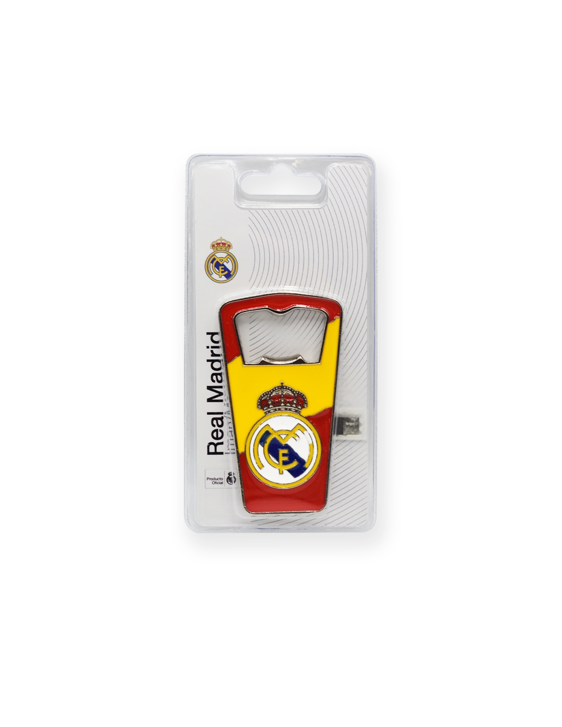 Este imán abridor combina el escudo del Real Madrid con los colores de la bandera de España, creando un accesorio que transmite pasión tanto por el club como por la selección. Con acabado metálico y diseño vibrante, es perfecto para quienes sienten los dos escudos en el corazón.
