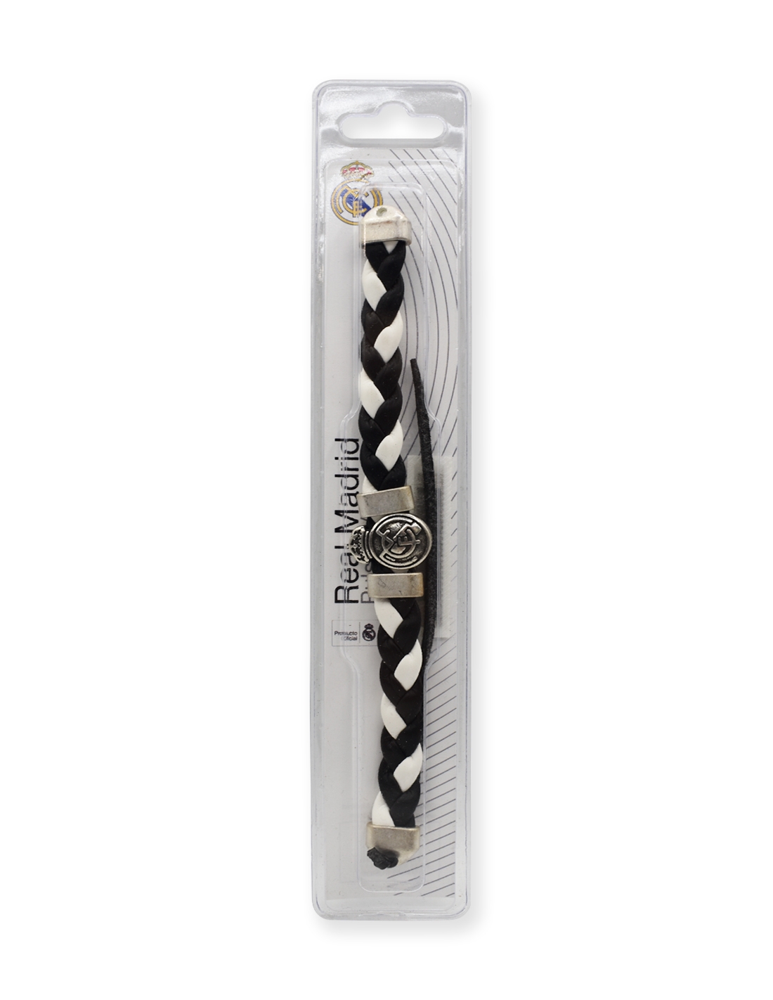 Esta pulsera trenzada en blanco y negro combina el carácter del cuero con la identidad del Real Madrid. Su diseño entrelazado y el escudo metálico en el centro la convierten en un accesorio con personalidad propia.