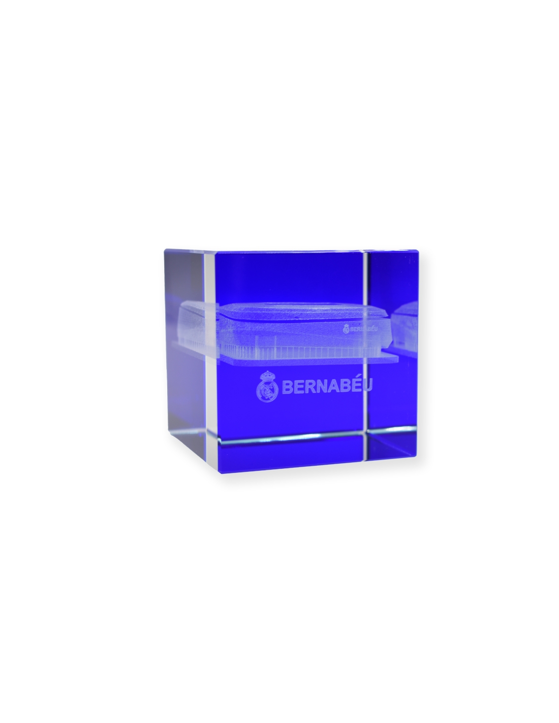 Este bloque de cristal con grabado 3D del Estadio Santiago Bernabéu es una pieza única para cualquier aficionado del Real Madrid. Con un diseño elegante y minimalista, representa con detalle el templo blanco en formato decorativo. Ideal para tener en tu escritorio, estantería o vitrina, y recordar siempre dónde late el corazón madridista.