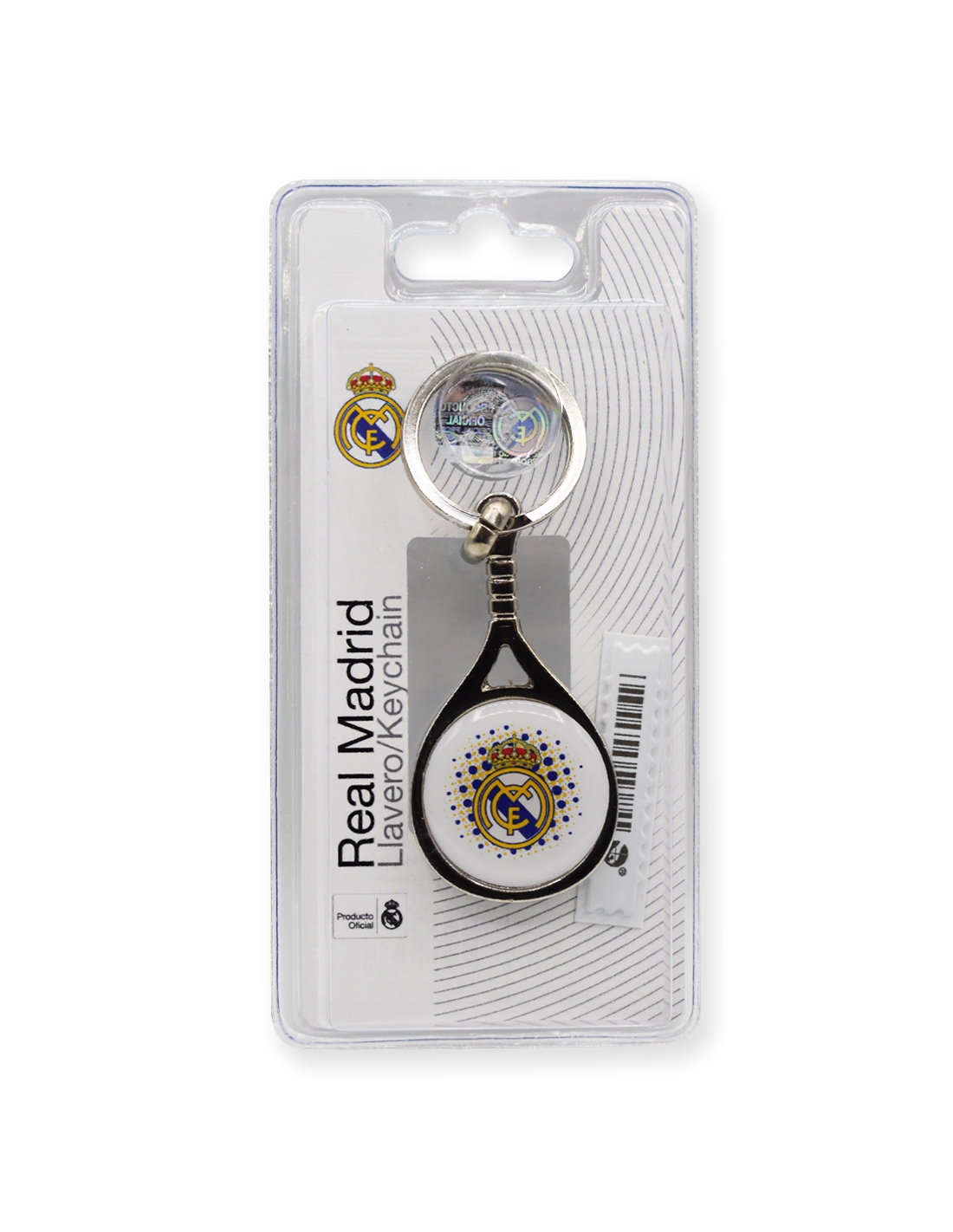 Con un diseño original en forma de raqueta de pádel y el escudo oficial del Real Madrid en el centro, este llavero es perfecto para los amantes del club y del deporte.