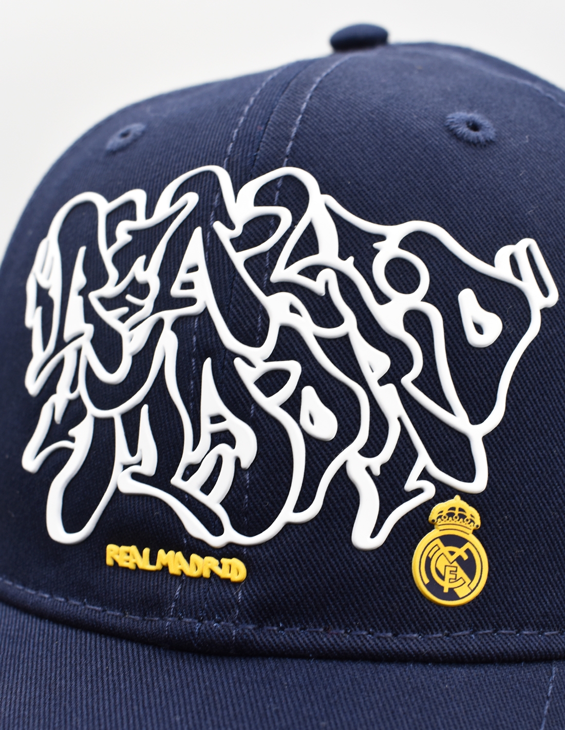 Marca estilo dentro y fuera del estadio con la Gorra Graffiti Blue del Real Madrid. Un diseño atrevido y diferente que combina el arte urbano con la pasión por el fútbol. El logotipo del club aparece integrado en un lettering tipo graffiti en blanco, acompañado del escudo oficial en amarillo, para un acabado potente y original.