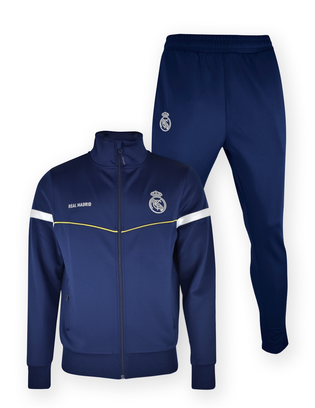 Chándal Real Madrid Navy Gold. Azul marino con detalles dorados, escudo oficial y tejido técnico. Estilo, comodidad y orgullo madridista en cada detalle.