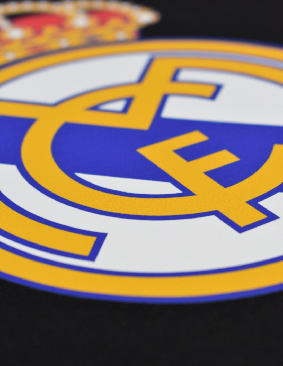Diseño elegante: escudo del Real Madrid con detalles plateados y tipografía moderna.
